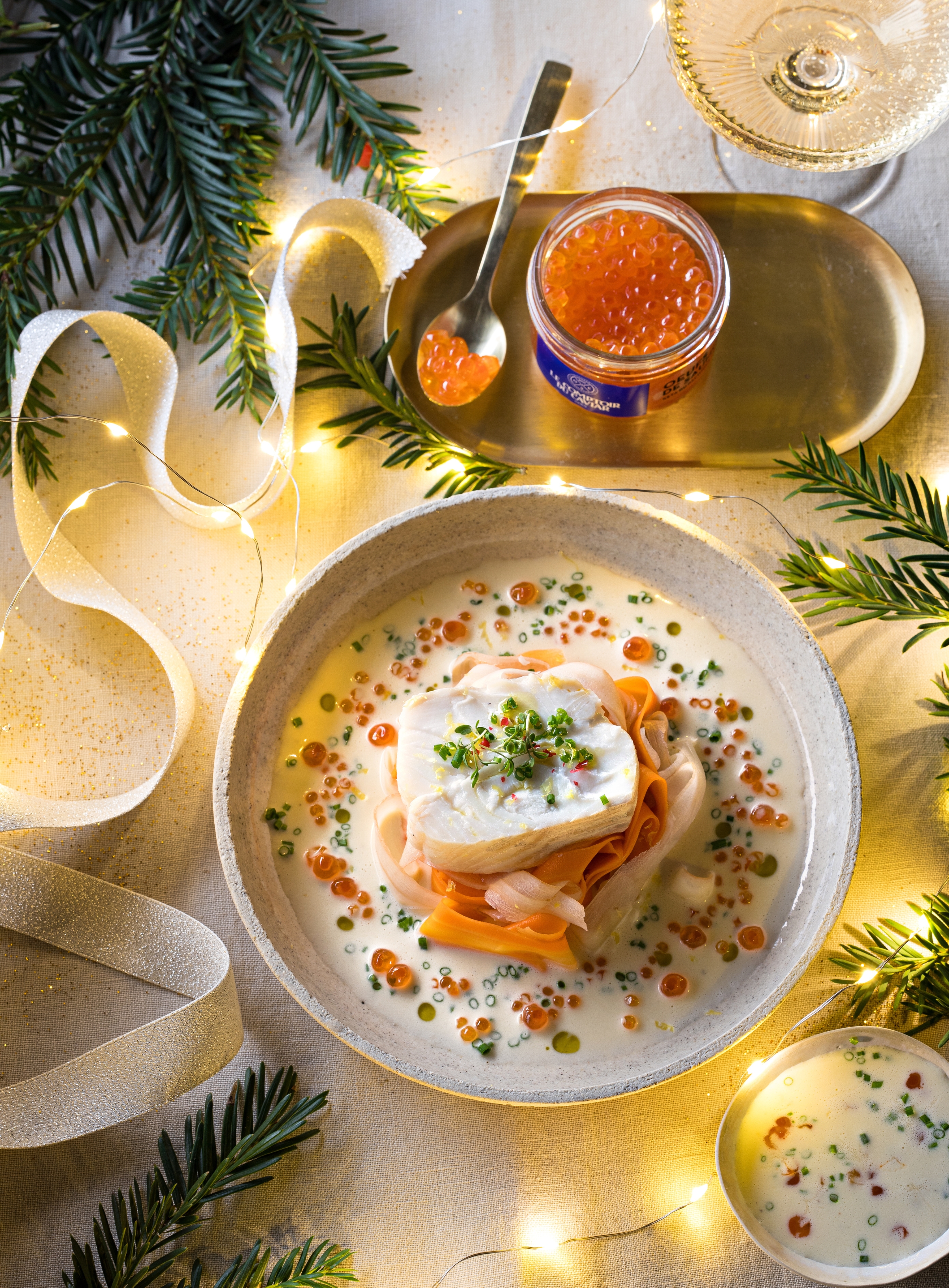 Une recette tout en délicatesse où le poisson révèle sa tendresse en papillote, sublimé d’un beurre blanc aux œufs de poisson et d’une huile verte parfumée. Un plat raffiné, simple et élégant, signé Le Comptoir du Caviar.